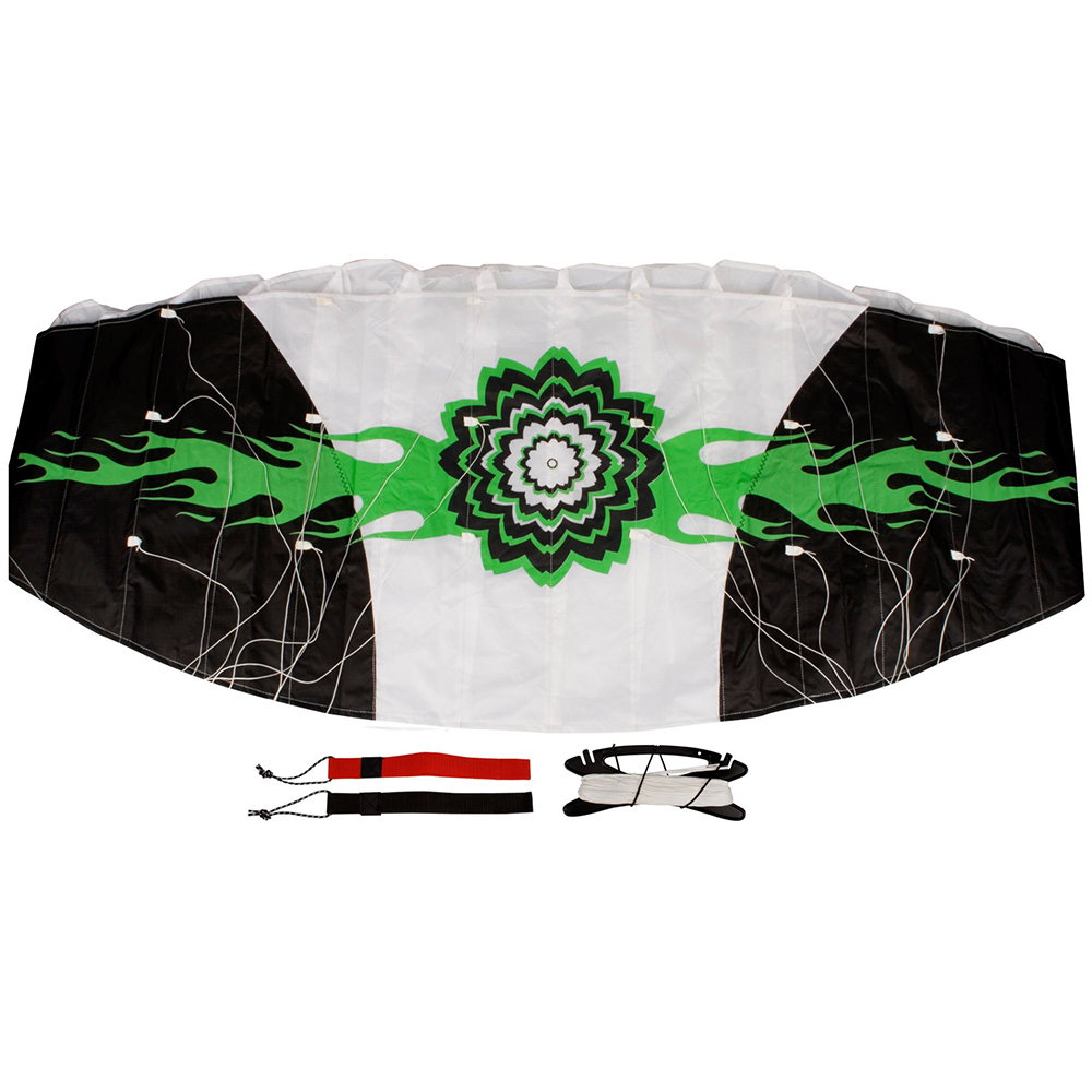 The Grial 140 parachute Airow's is a mattress kite with a robust print. The solid lines with wristbands ensure that the parachute is an ideal kite tricks. By the wrist bands you have in combination with the 30 meter long plane lines additional control over the parachute.
