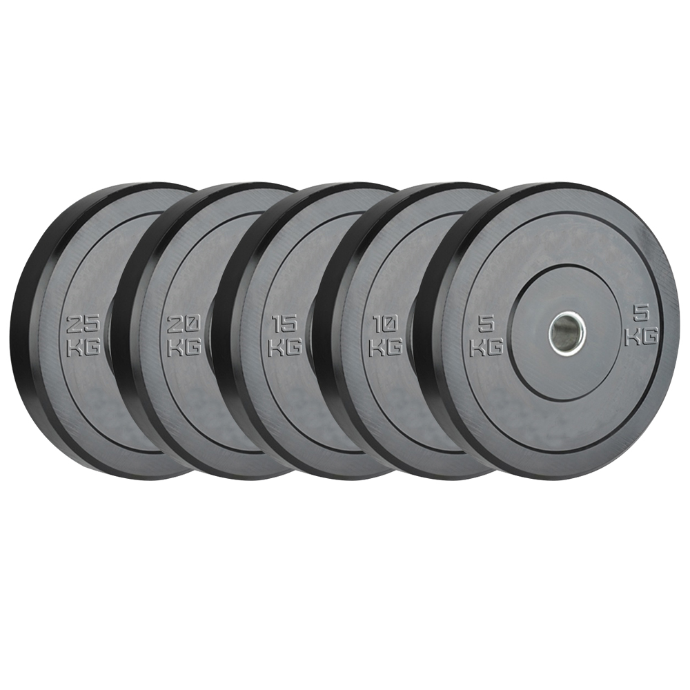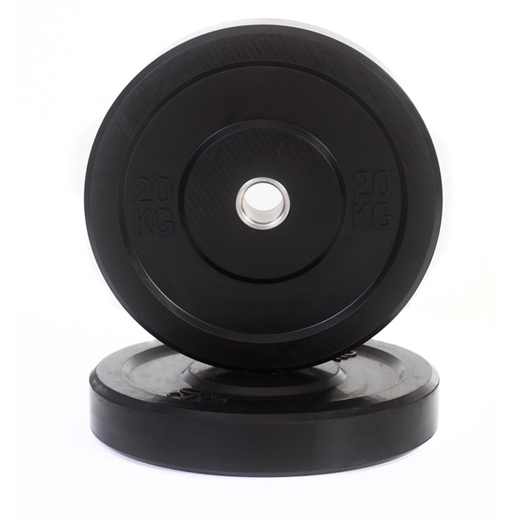 Solid Rubber Olympic Bumper Plates, with chemically bonded 10mm steel inserts. Low bounce, and great durability tested by 10000 drops on fitness floor from 1.5 m height. Minimalist styling in black. Available in different weights