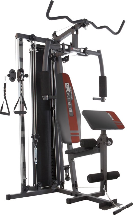 The HAMMER Multi Gym Ferrum TX2 -- quick workout results thanks to professional equipment details: cable pull module and power bar. bar for about 45 exercise options. The Ferrum TX2 from HAMMER is an effective and compact "turbo-strength" with-which you can work intensely all The important muscle groups. Even in tight spaces (space requirements only 150 x 110 x 200 cm) you can easily work your chest, back, shoulder, arm and leg muscles