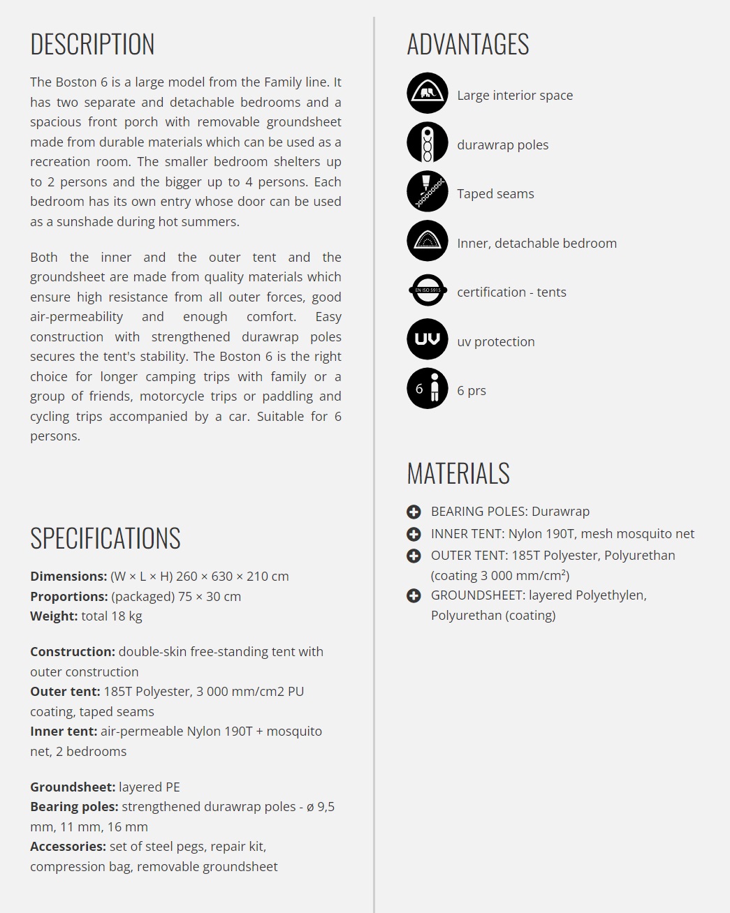 The BOSTON tent is a double-shell single tent with outer construction and reinforced laminated poles of average 9.1 mm. The outer tent is made of 185 Polyester with water protection of 3000 mm/cm2. The inner tent is made of 190T breathable Nylon and features a mesh mosquito net for good air circulation. Tent's floor is made of 190T Polyester with PU coating 5000mm/cm2.