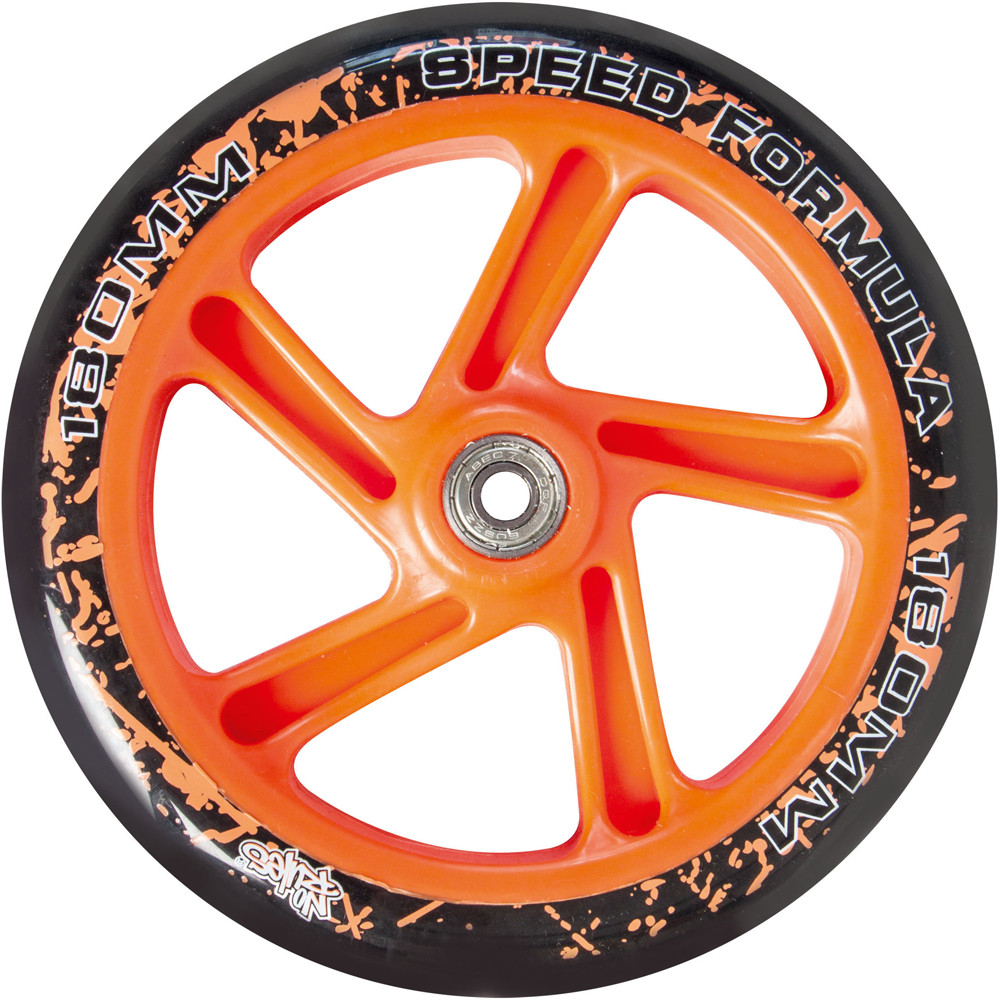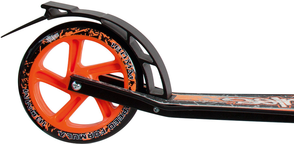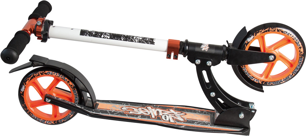 Scooters are cool, certainly with this No Rules aluminum scooter! The No Rules scooter has an oval extra-large footboard that can be countered by the edge reinforcement. With mudguards on the front and rear wheels of this scooter you can stepping on any terrain without being extremely dirty. For safety, this step is provided with reflectors and a stable brake. No Rules makes scooters for tough guys and girls who love graffiti and comics. This orange No Rules scooter has graffiti details. Thanks to the new Easy Fold system, the No Rules folding steering wheel is fast expanded and expanded and with the handy carrying strap you take the step easily wherever you go. No Rules is part of Authentic Sports & Toys and specializes in making high quality scooters for young people from +/- 7 years.