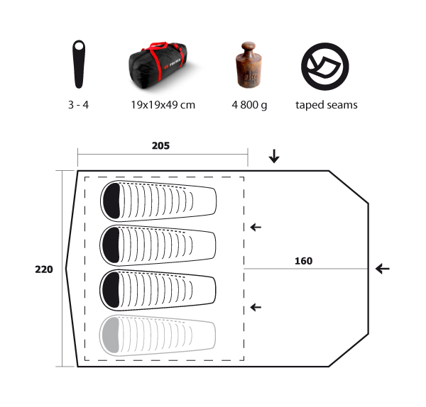 A tent for 3 to 4 persons. Trimm EAGLE features a large and easily accessible porch that can be opened from both sides. The spacious porch provides with enough space for your belongings (even bicycles!) and camping equipment or it can be used as an extra sleeping place. This tent is higly valued for high comfort, ergonomic design and balanced price and quality ratio!
