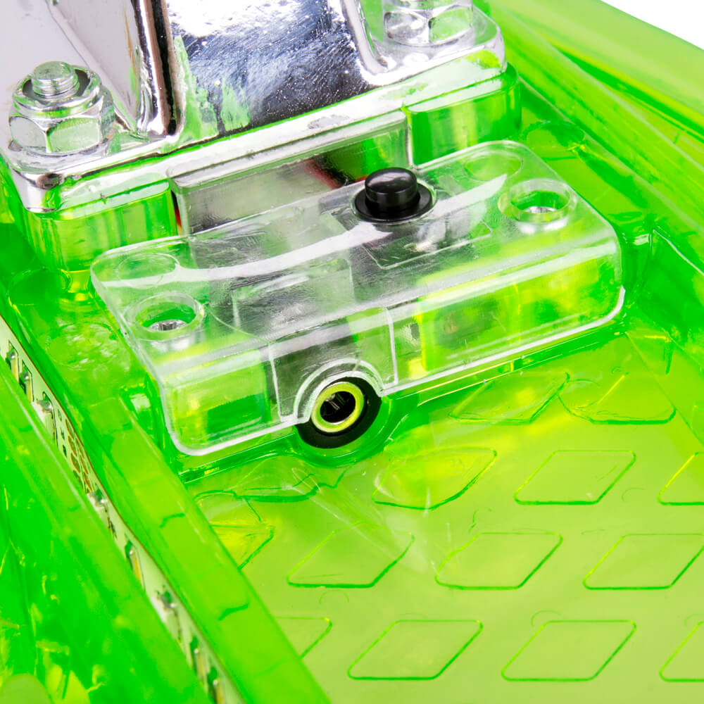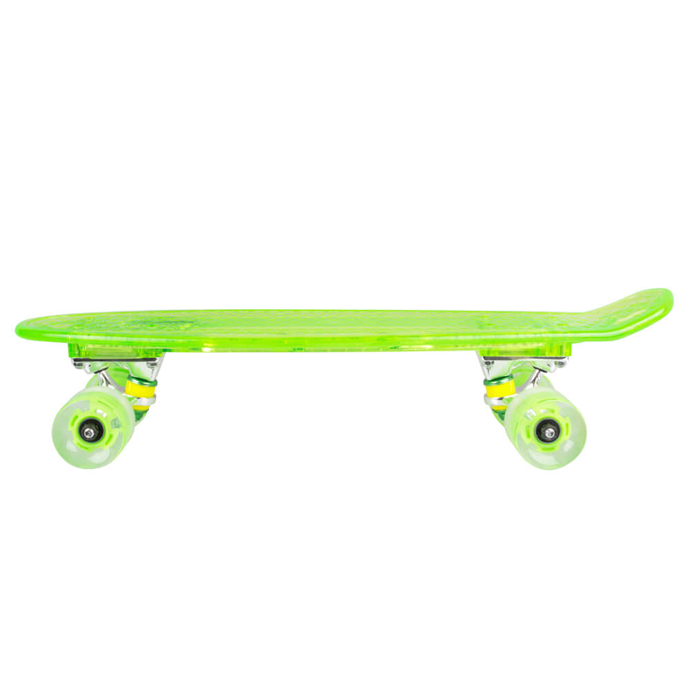 Light-Up Penny Board WORKER Lumy 200 is striking and impressive for many reasons. The transparent deck that lights up through a LED strip looks very effective, especially at night. This stylish feature is only accentuated further by LED wheels. The wheels light up while spinning, creating electromagnetic energy that fuels the LED diodes without the need for a battery. The deck, on the other hand, is powered by a battery. However, it can be recharged through a charger with a USB connector.