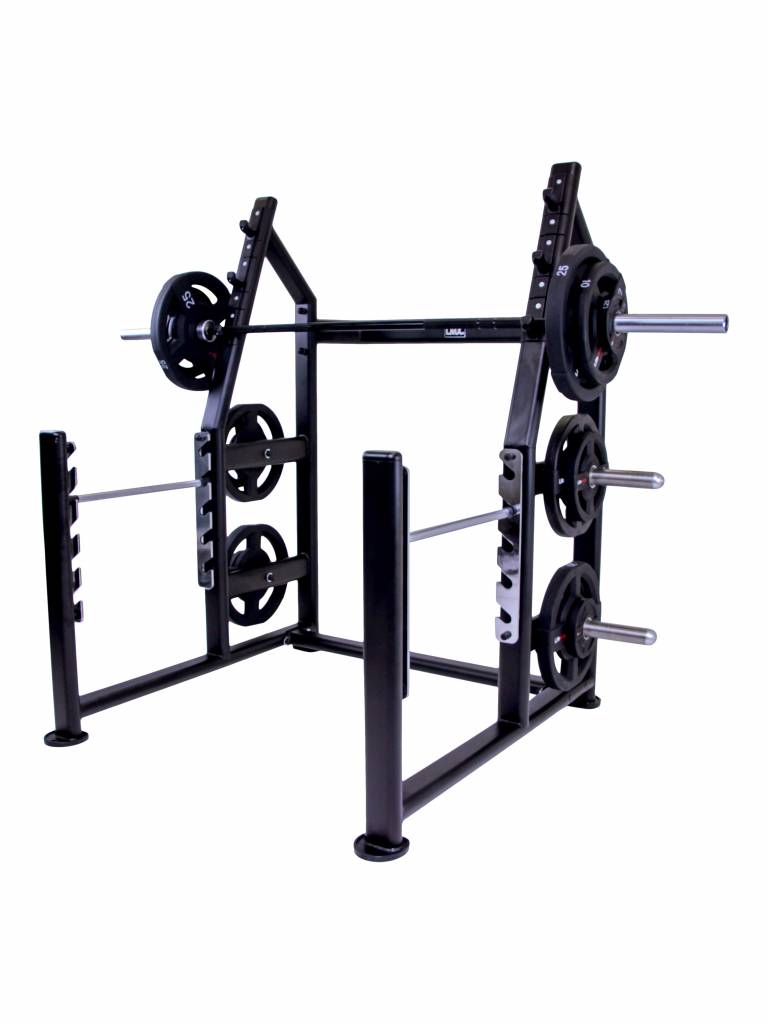 The bar can be grabbed from 3 positions and the rack has integrated, adjustable spotting arms so that you can safely squash.
