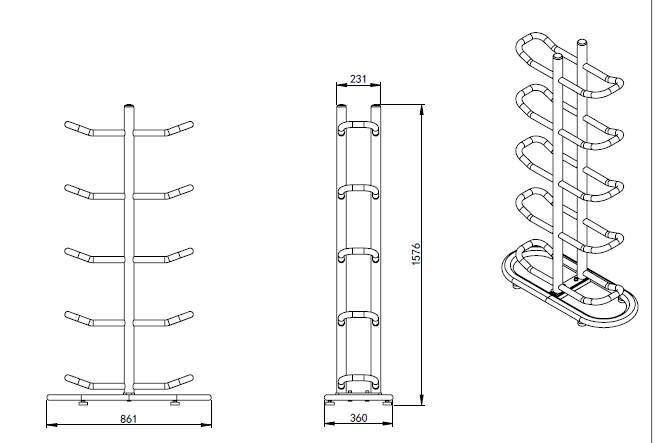 The medicine ball rack is 158 cm height, 86 cm wide and 36 cm deep, it weights 29.5 kg.