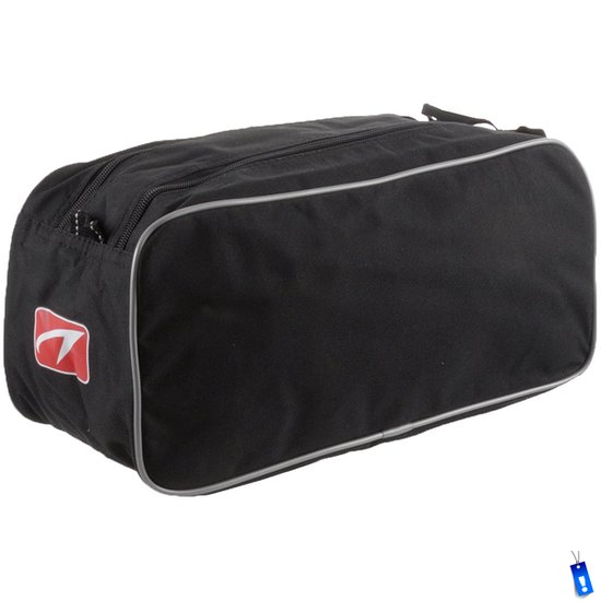 Very sturdy shoe bag suitable for soccer shoes, hiking shoes, running shoes and cycling shoes. This shoe bag has a double zipper on the top, making it very easy to get the shoes in and out of the bag. For protection of the zipper there is a flap with Velcro at the top. The front pocket also has a zipper. The shoe bag has a strong carrying strap and is suitable for 1 pair of shoes up to size 50.