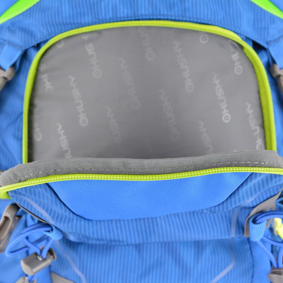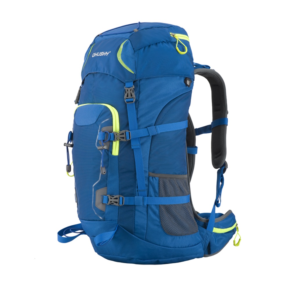 Unisex Husky backpack, model Sloper 45 L, climbing backpack with top lid with two buckles and two-point tightening, mesh zip pocket, zip pocket and elastic loops on flap. Main compartment with pocket for water bag with port, zip pocket on front, simple mesh pockets and compression straps on sides, loops to attach hiking gear, loops for ski, bottom zip pocket with rain cover. Back part with outstanding ventilation system and mesh back system with reinforcement that adapts Your back shape, breathable padding on anatomically shaped shoulder straps, reinforced hip belt with length regulation and zip pocket, vertically adjustable chest belt, highlighting features. 420D 2-tones Ripstop/ 600D Polyester, weight approx 1 300 g, volume 45 L, size approx 60 x 30 x 21 cm.