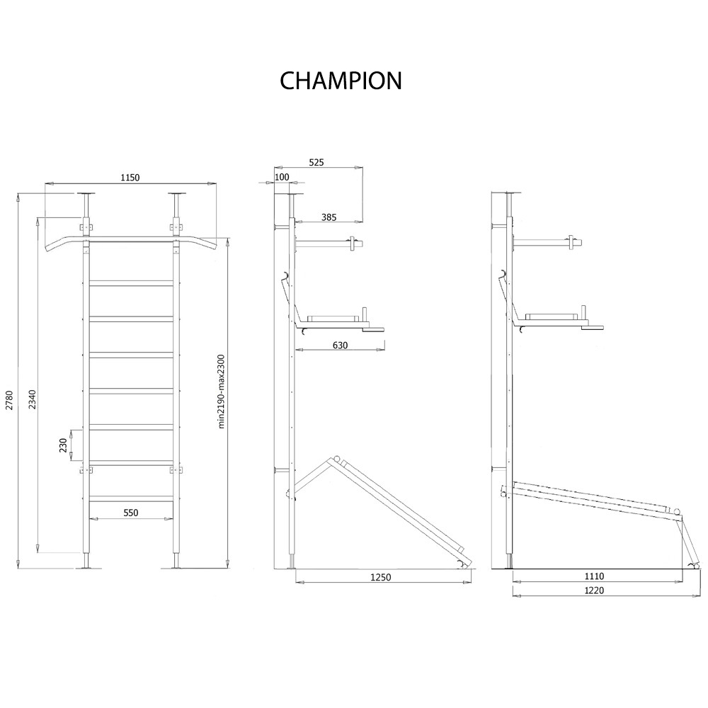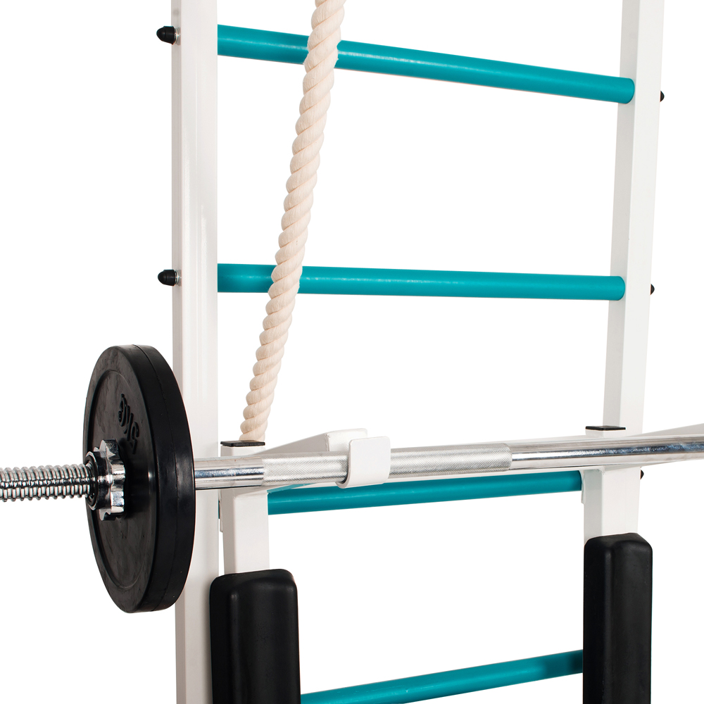 Benchbark Wall Bars Champion are designed for home exercising. They will help you improve your physical fitness, strengthen your muscles and improve your coordination. It is a set of metal wall bars, gymnastics rings, rope, a pull-up bar, a bench and parallel bars that can be placed on the wall bars at will (turned upside down they can be used as a barbell holder). A such, it provides countless ways to exercise. The frame is designed in a way tat allows you to switch from one exercise station to another. There is a bracing system to place the wall bars between the floor and the ceiling while also affixing it to a wall. The cross bars are made of metal covered with anti-slip plastic. The wall bars also meet the highest safety standards for gymnastics equipment.