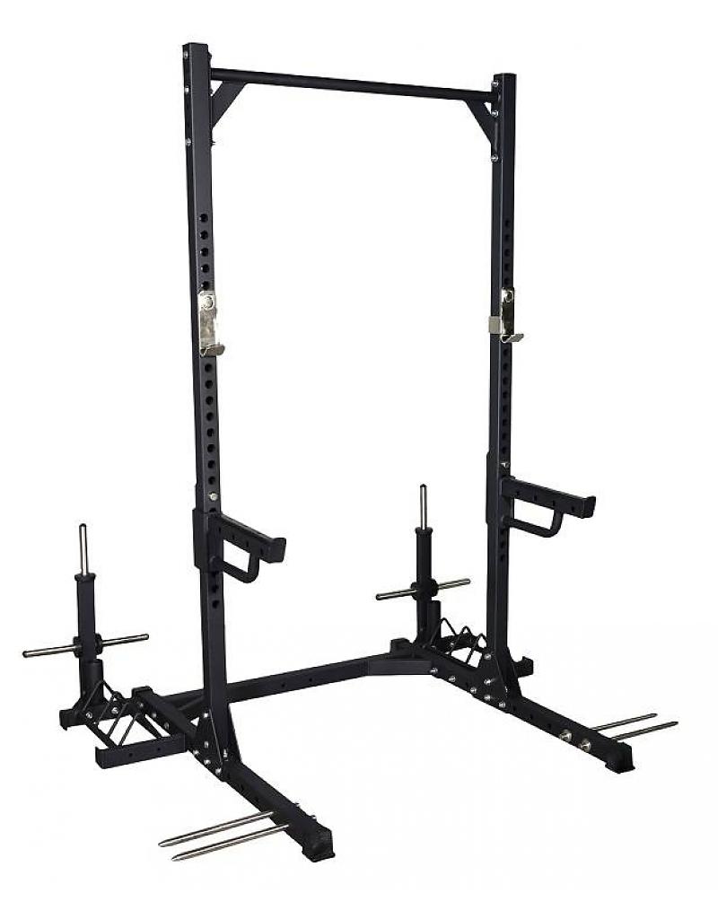 The robust, matt black powdercoated squat rack comes with J-hook set and adjustable Spotting arms, which are lined with rubber protection.