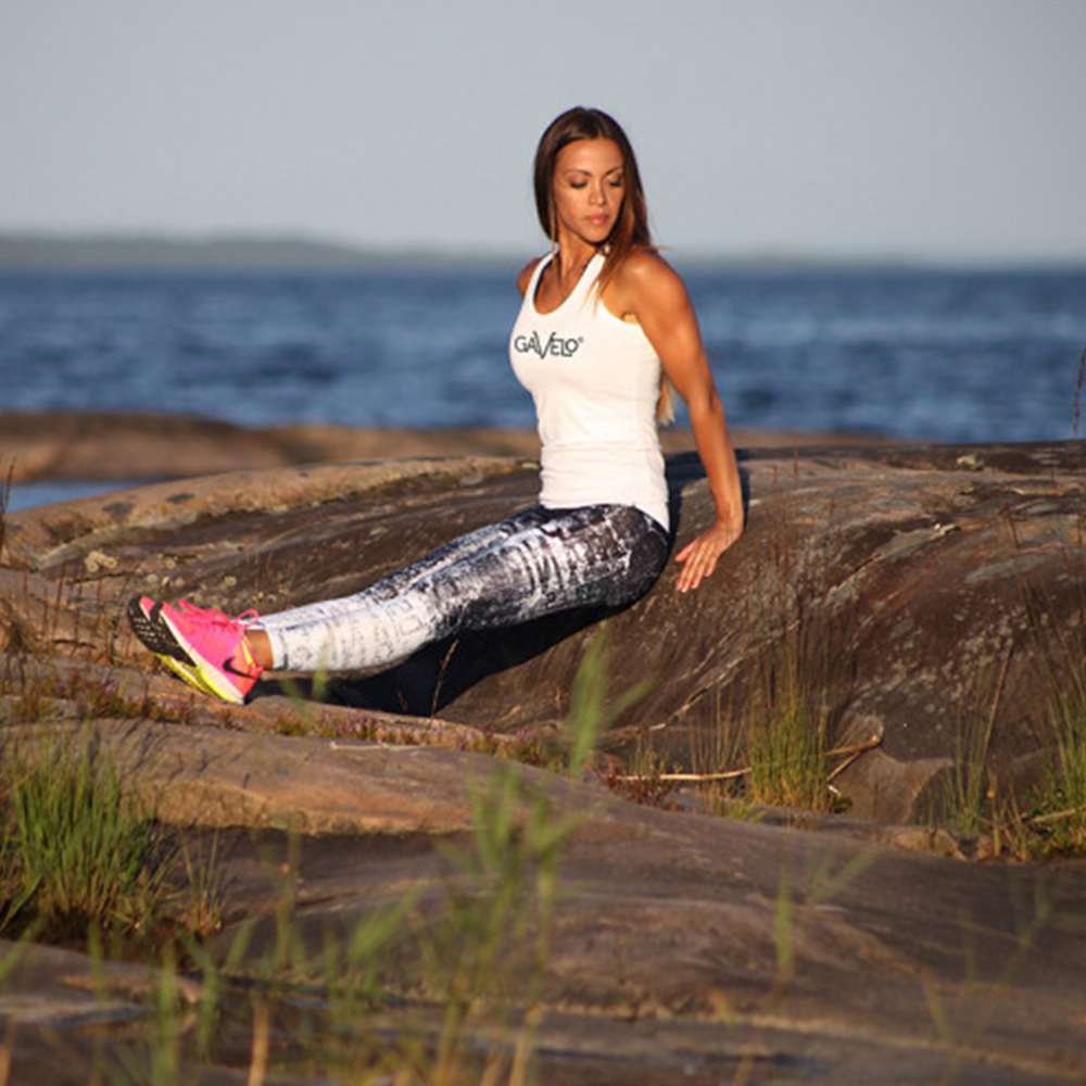 Working out with the compression leggings of Gavelo will be easily. The compression legging is available in different colors/prints, the Eclipse Gavelo compression legging features Gavelo logo on the right thigh in style of a newspaper. The city of Los Angeles is brought back several times in the pants. To finish off your sports outfit you can match it with a sports bra!