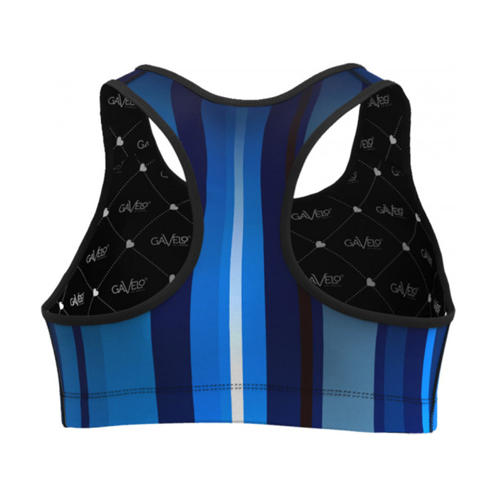A sports bra is the ideal support during the most intensive work-outs and sports. The racerback design allows full range of motion. A nice and decorative lining, that makes for good breathability. This bra is made of recycled polyester 73% and 27% lycra. The combination of blue and white stripes on the Gavelo Still sportbeha give it an attractive design.