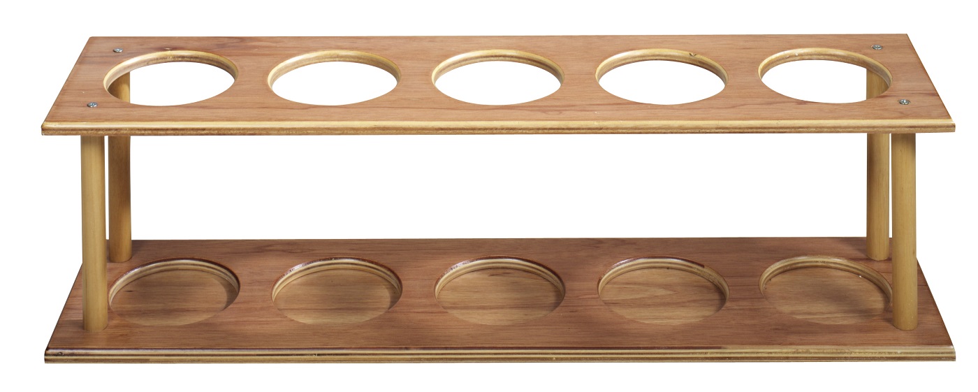 The Rack consists of two boards of about 1.5 cm and 2 cm thick. In boverste board are 5 machined holes of 15.5 cm in diameter. The both parts are by four round wooden intermediate pieces connected to each other.