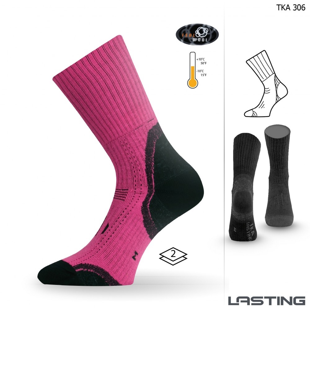 Trekking socks TKA from Lasting is a medium thick, elongated trekking socks made of BB ACRYL and isolwool, which offer a high durability and outstanding thermal comfort. The socks have been designed to provide a high thermal insulation and protection against blisters. The material has a ribbed structure (1). The bottom and heel sections are fitted with a three-layer plush (2), offering high mechanical resistance.