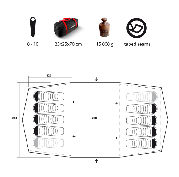 | Dimensions | Length 220 + 220 + 260 cm porch. Height 200 cm. |