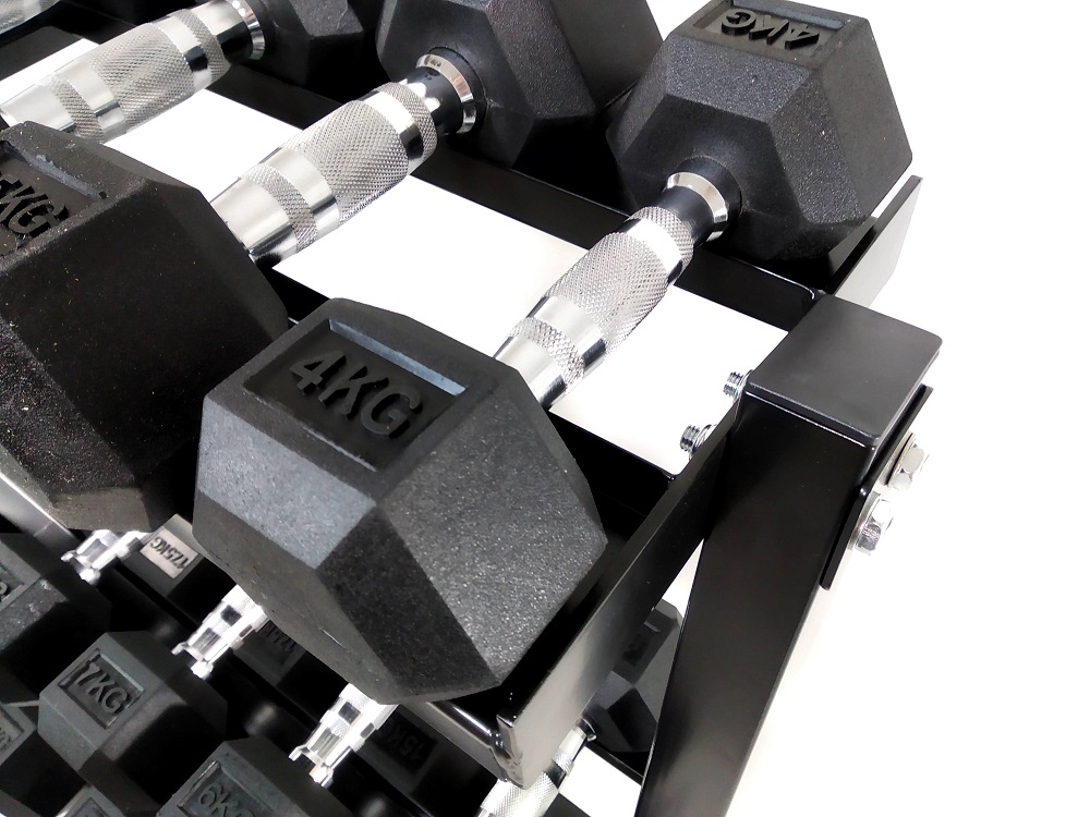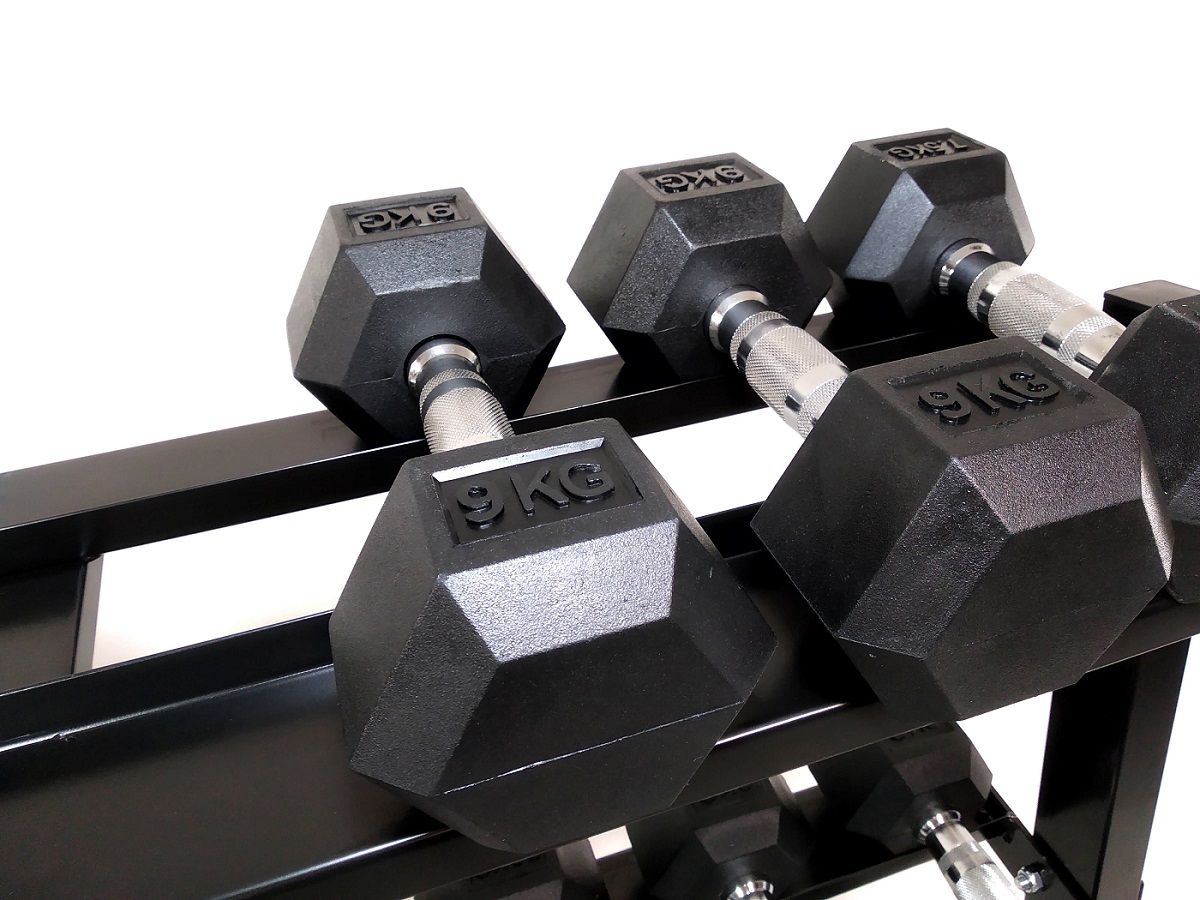 Sportbay rubber coated hexagonal dumbbells with ergonomic handle are designed for increased comfort and improved durability. The rubber coating reduces noise, improves life cycle of product. Rubber coated dumbbells are also kinder on floor surfaces. The hexagonal shaped ends are designed to prevent the dumbbell from rolling on the floor or dumbbell rack.