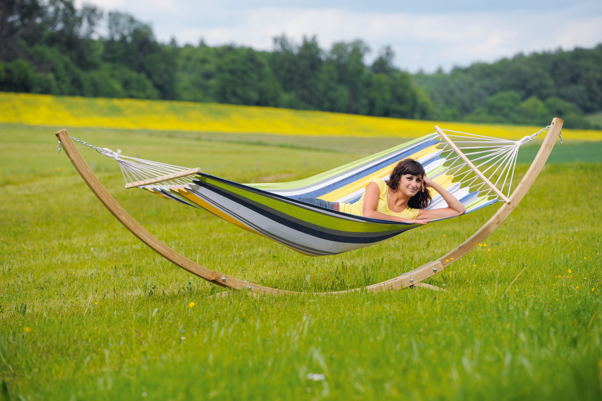 Hoe lig je in een hangmat? Belangrijk is de lussen van de hangmat op de hoogte van de kop en met 3 meter afstand op te hangen, zodat de hangmat een diepe boog vormt. Zo is het mogelijk diagonaal te liggen, traditioneel Braziliaans "from corner to corner". Hierdoor blijft je rug in een rechte positie, dat is het geheim van uren comfortabel liggen en relaxen. Als de hangmat goed is vastgemaakt, is het mogelijk veilig in de hangmat te liggen zonder bang te zijn eruit te fallen.