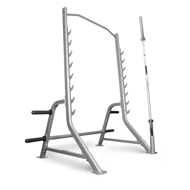 Het Body Craft squatrek is een multifunctioneel apparaat voor elke sportschool. Dit stevige rek is gemaakt van hoogwaardige kwaliteit staal met een laadvermogen van max. 360 kg. Het beschikt over vier doornen voor halterschijven met een diamater van 50-mm en een rek voor lift bar. Het oppervlak is mat zilver met vernis als bescherming tegen vocht en krassen. Het kan worden gebruikt voor squats, death pull. Als je een bankje toevoegt (niet inbegrepen), kan je het voor bankdrukken en andere workouts gebruiken. De bovenste transversale balk van dit product kan worden gebruikt als een horizontale balk.