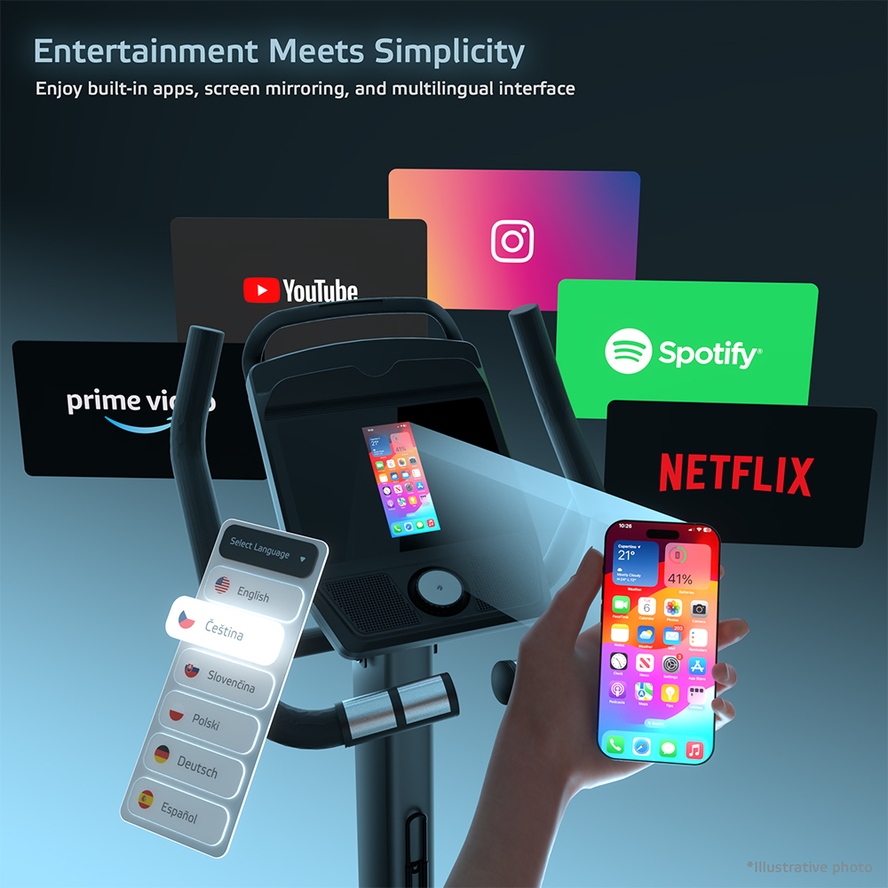 De slimme console brengt een hele nieuwe dimensie naar je thuisworkouts. Hij ondersteunt mobiel scherm-mirroring, biedt taalopties in Tsjechisch, Slowaaks en Pools, en heeft entertainment-apps die je training tot een leuke ervaring maken. Je kunt ook Bluetooth-hoofdtelefoons verbinden om Netflix of YouTube te kijken zonder anderen te storen – begin gewoon met trappen en je favoriete show speelt mee!