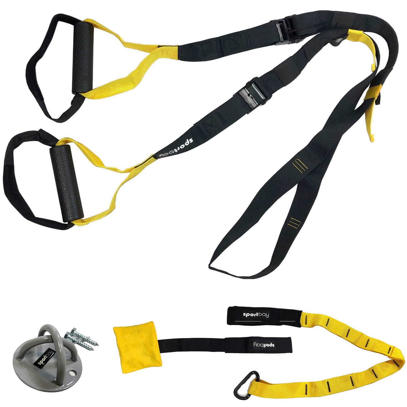 Wat krijg je als je de Sportbay® Suspension trainer PRO Original koopt? Simpelweg alles was je nodig hebt om meer dan 100 oefeningen uit te kunnen voeren met het hele lichaam.