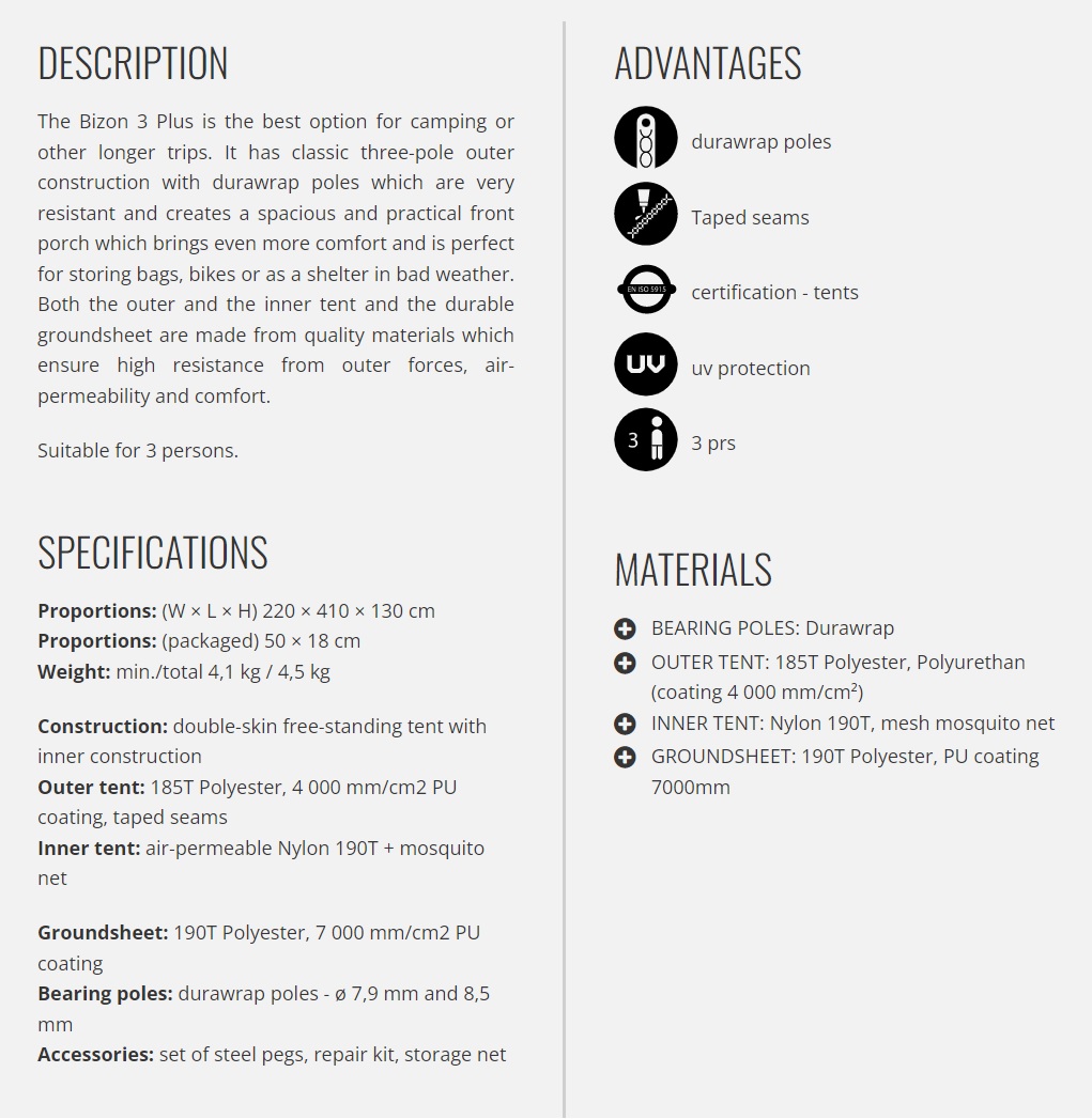 De Bizon 3 Plus is de beste optie voor op de camping of andere lange reizen. De tent heeft een klassieke 3-paals constructie bestaande uit speciale dura wrap palen. Deze zijn zeer stevig en creëren in deze constructie een ruimtelijke en praktische voortent om tassen en fietsen in te plaatsen of te schuilen voor eventueel slecht weer.