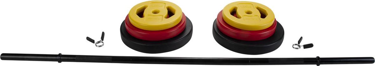 De Pure2Improve Halterset. Een essentieel product voor uw krachttraining, zeer geschikt voor thuis gebruik. De set bestaat uit een stang, feather locks en drie paar gewicht-schijven. De gewicht-schijven bestaan uit 2x5kg schijven in zwart, 2x2,5kg schijven in rood, 2x1,25kg schijven in geel. Het gewicht van de schijven zijn door deze kleuren makkelijk te herkennen en hierdoor wordt het wisselen in gewicht vergemakkelijkt.