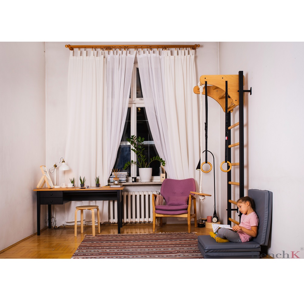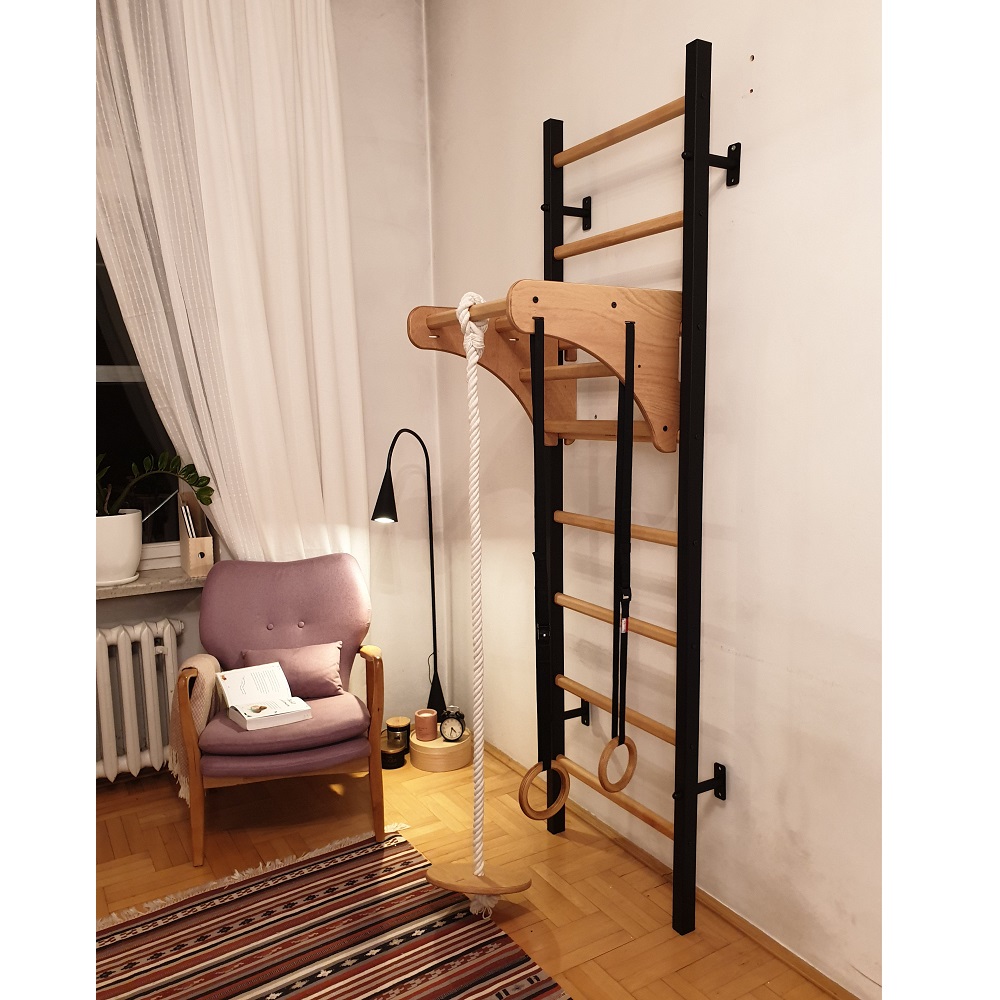 De Wall Bars Benchmark 212B is een perfecte combinatie van de twee materialen, metaal en hout – en hun beste eigenschappen. Het metalen frame zorgt voor een perfecte stabiliteit en een hoge duurzaamheid, terwijl de houten balken aangenaam zijn om aan te raken en zorgen voor een perfecte grip. Dankzij hun aantrekkelijke design, kan de Wall Bars Benchmark 212B passen in elke kamer. Bedoeld voor thuis oefening, deze muur bars die u zullen helpen verbeteren van uw conditie, het versterken van uw spieren en het verbeteren van uw balans. Deze Wall bars zijn voorzien van een uitneembare houten pull-up bar biedt een verscheidenheid van handgrepen, waardoor je tot het uitoefenen van alle de spieren in uw bovenlichaam – schouders, borstspieren en terug. U kunt verder met uw training opties met weerstand banden, suspension trainers of soortgelijke opleiding accessoires. Hang je de pull-up bar op een van de balken, waardoor het geschikt is voor kinderen, die kunnen ook genieten van de gymnastiek ringen met in de lengte verstelbare bandjes en de hangende swing. De hoogte maakt de Wall Bars Benchmark 212B geschikt voor bijna alle hoogtes. Als u op zoek bent naar een universele station voor een full body workout, dan is de Wall Bars Benchmark 212B met een pull-up bar de perfecte keuze.